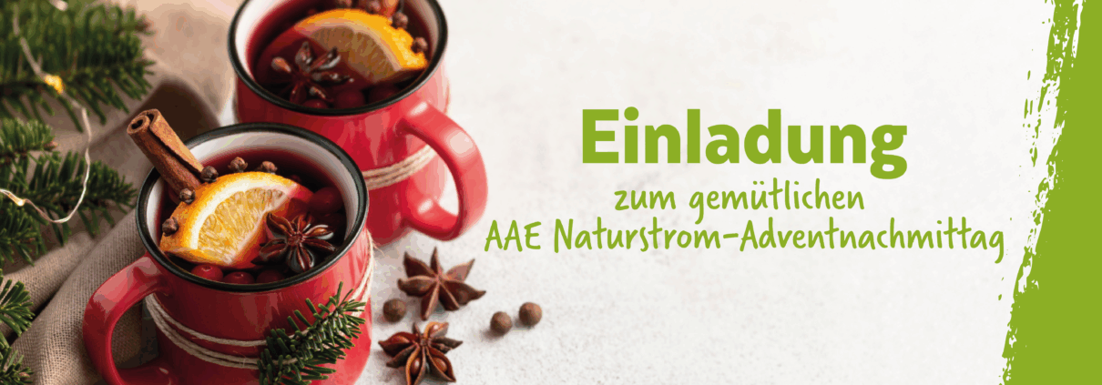 Deshalb laden wir Sie sehr herzlich zu einem gemütlichen Beisammensein ein. Freuen Sie sich auf duftenden Punsch, Glühwein und herzhaft belegten Brötchen mit regionalen Zutaten. Genießen Sie in entspannter Atmosphäre den Austausch mit anderen Naturstrom-Freunden und dem AAE-Team.