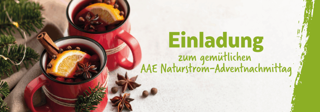 Deshalb laden wir Sie sehr herzlich zu einem gemütlichen Beisammensein ein. Freuen Sie sich auf duftenden Punsch, Glühwein und herzhaft belegten Brötchen mit regionalen Zutaten. Genießen Sie in entspannter Atmosphäre den Austausch mit anderen Naturstrom-Freunden und dem AAE-Team.